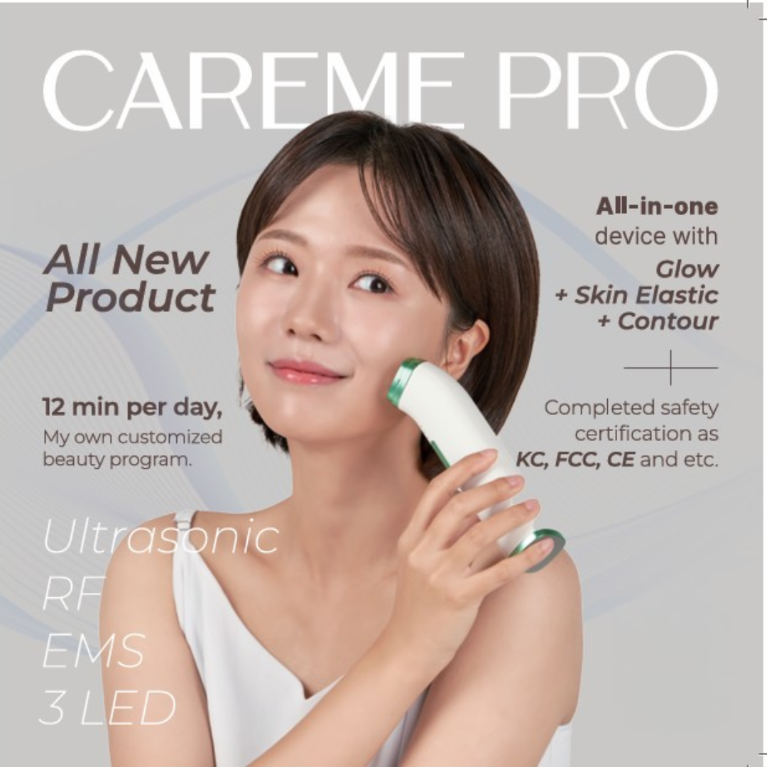 CAREME PRO is an all-in-one beauty device designed to enhance skin glow, elasticity, and facial contour using advanced Ultrasound, RF, EMS, and LED technologies.