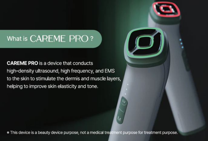 CAREME PRO helps improving anti-aging, lifting and glow skin with 1 device using 12 min per day which adopted 4 different technologies.