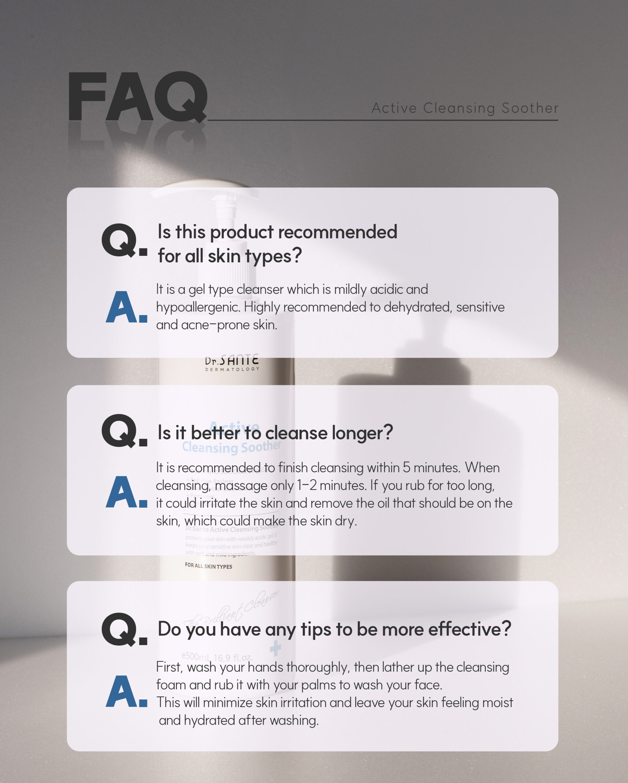Our skin stays the healthiest in the mildly acid. Active Cleansing Soother is a cleanser maintaining a condition similar to the most healthy skin state of mildly acidic pH5.5 and hypoallergenic.