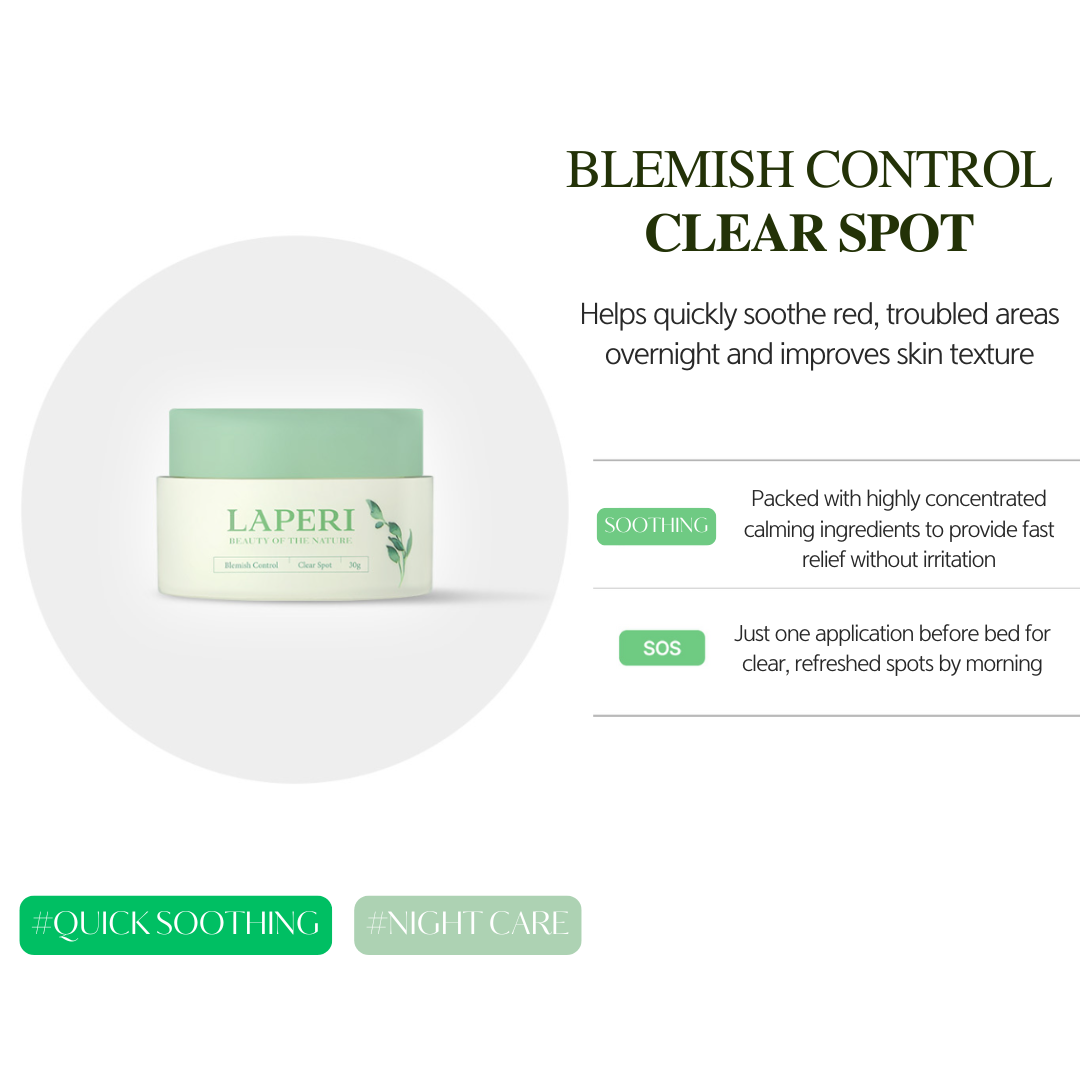 Laperi Blemish Control Clear spot (30g) Ingredients :Purified Water, Zinc Oxide, Calendula Officinalis (Marigold) Flower Oil, Glycerin, Cetyl Alcohol, Bentonite, Polysorbate 60, Caprylic/Capric Triglyceride, 1,2-Hexanediol, Dimethyl Sulfone (MSM), Kaolin, Stearic Acid, Trehalose, Cetearyl Alcohol, Prunus Amygdalus Dulcis (Sweet Almond) Oil, Glyceryl Stearate, Microcrystalline Wax, Ozokerite, Melaleuca Alternifolia (Tea Tree) Leaf Oil, Panthenol, Propolis Extract, Sorbitan Sesquioleate, Betaine, Betaine Salicylate, Sophora Flavescens Root Extract, Houttuynia Cordata Extract, Cetraria Islandica (Iceland Moss) Extract, Acer Saccharum (Sugar Maple) Extract, Arginine, Caprylyl Glycol, Pinus Pinaster Bark Extract, Allantoin, Sodium Polyacrylate, Butylene Glycol, Carbomer, Disodium EDTA, Polyglutamic Acid