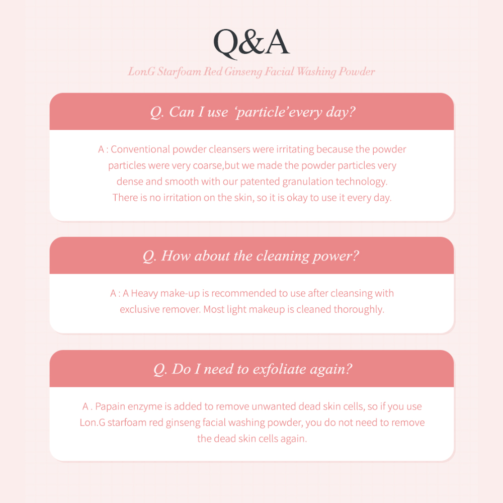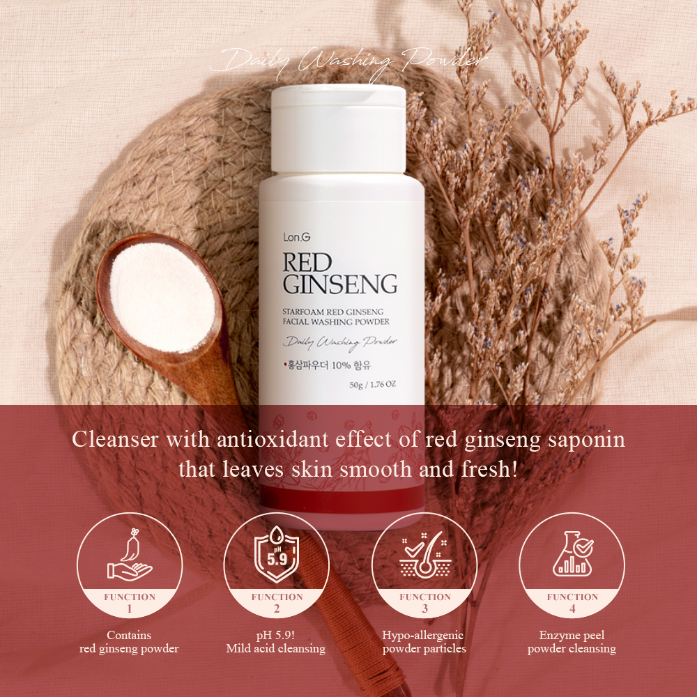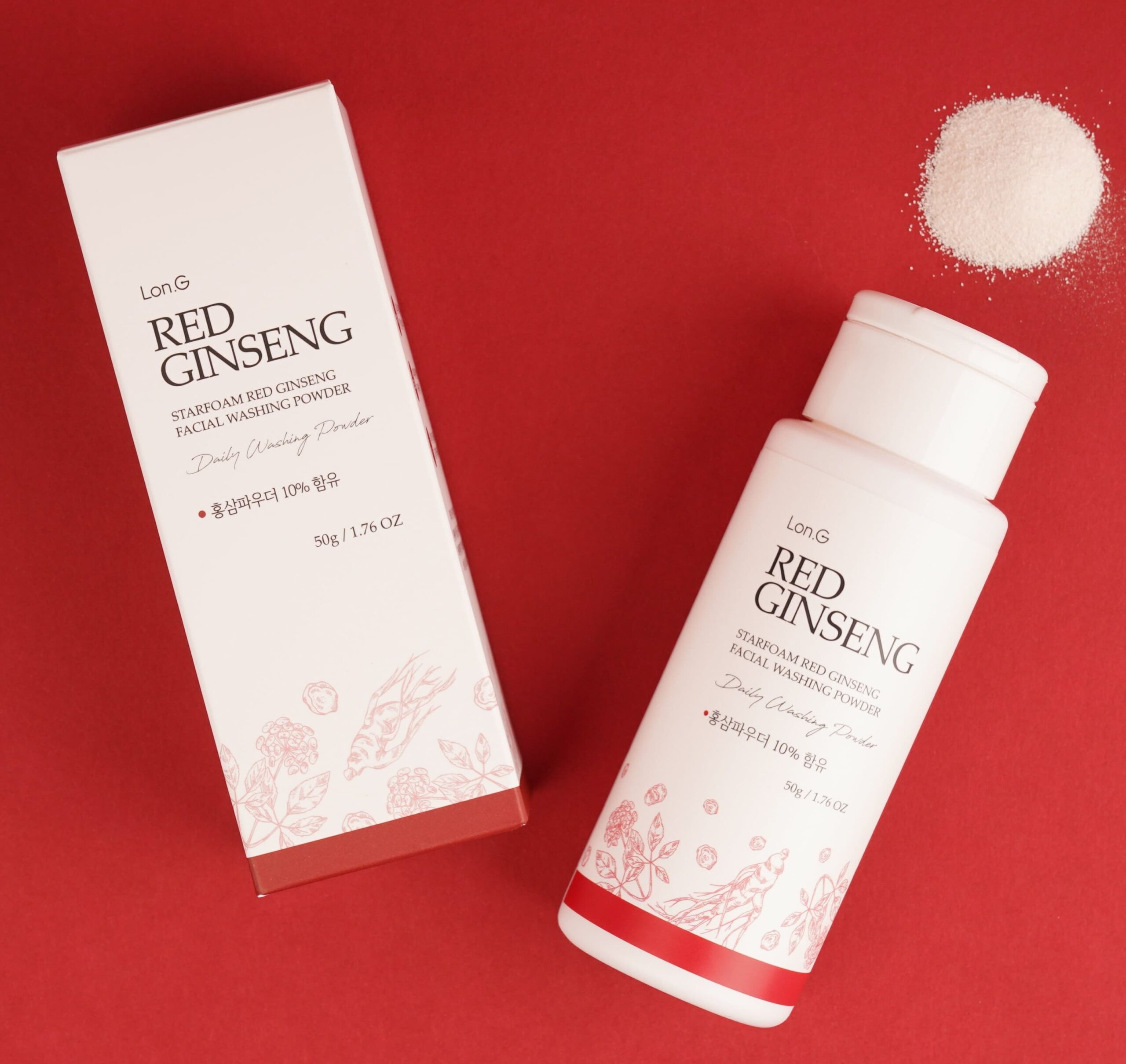 The Lon.G Starfoam Red Ginseng facial wash powder is a daily, enzyme-based cleansing product designed to gently remove sebum and dead skin cells. Its mild, weak-acid formula ensures thorough cleansing without irritating the skin, promoting a hydrated and smooth complexion. The inclusion of red ginseng extract supports skin nourishment and vitality. Ideal for sensitive skin types, this powder transforms into a creamy foam when you add water and is a very effective cleanser.