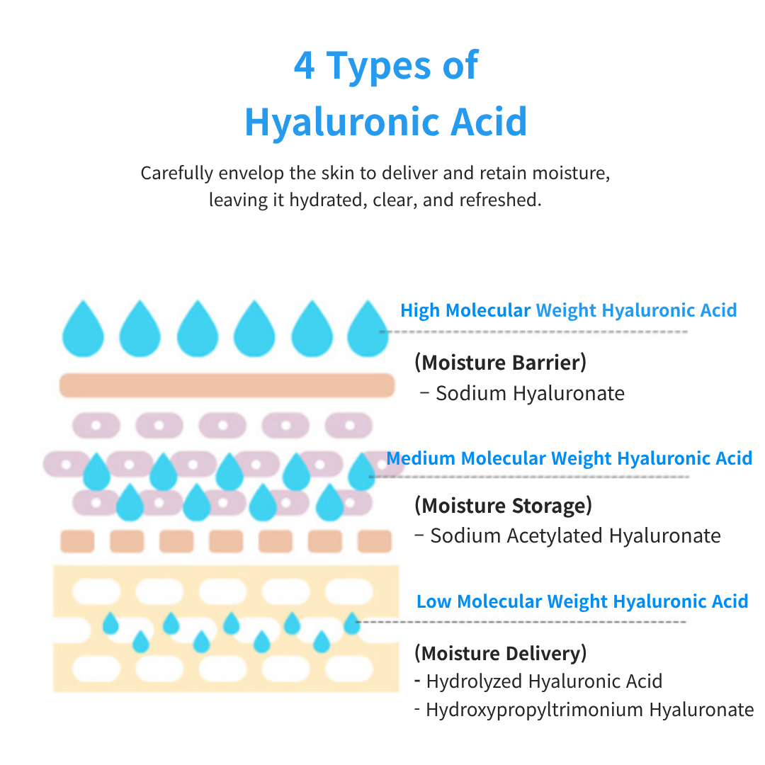 Sodium Hyaluronate (10 ppm), Hydrolyzed Sodium Hyaluronate (1 ppm), Hydroxypropyltrimonium Hyaluronate (1 ppm), Sodium Acetylated Hyaluronate (0.1 ppm)