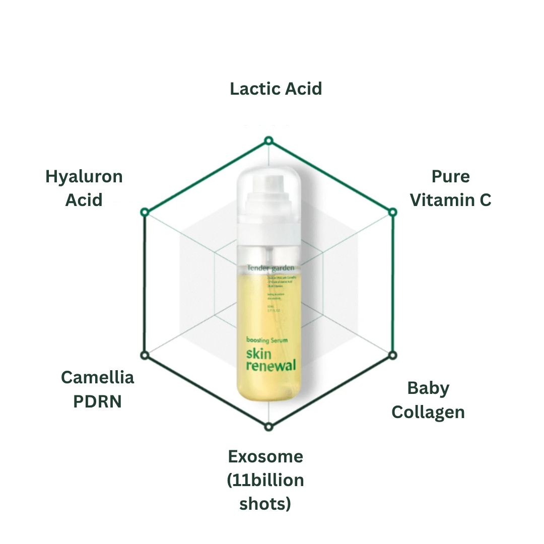 Tender garden Skin Renewal Dual Boosting Serum Key Ingredients : Camellia PDRN, Exosome, baby collagen, Vitamin E oil