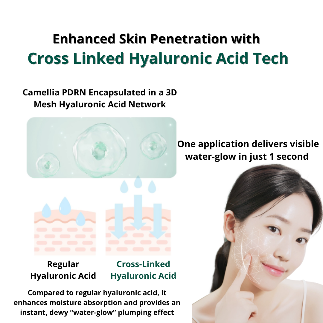 Three-dimensional mesh-structured hyaluronic acid combined with the vitality of camellia plants that bloom even in harsh winter, delivering hydro plumping effects that surge from within the skin.