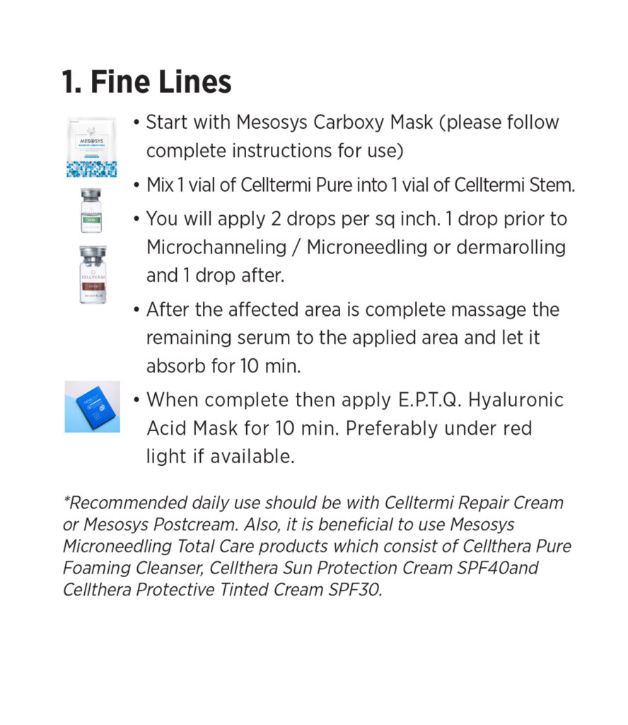 The first procedure is Fine Lines and Wrinkles. With this protocol it will show you how to eliminate fines lines and wrinkles, using a Carboxy Mask, Pure, Stem, E.P.T.Q mask and after care products.